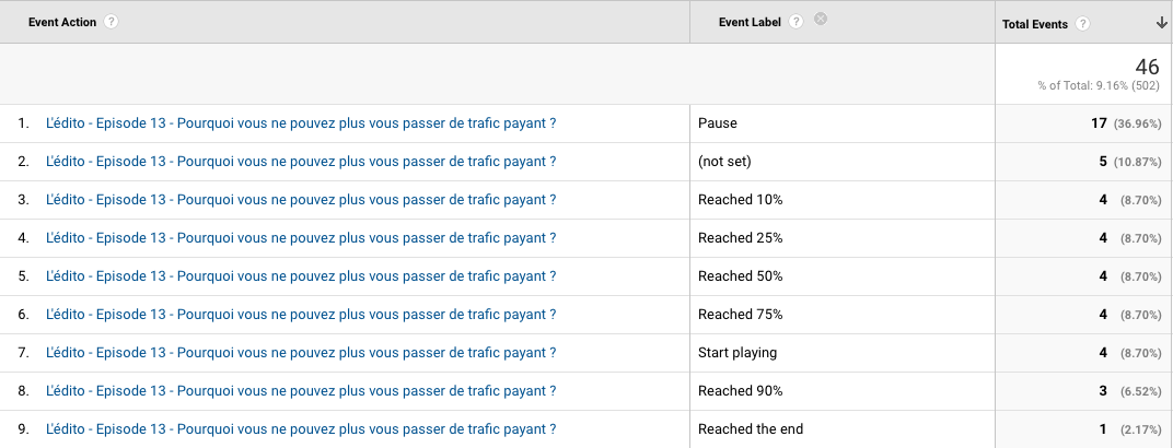 Toutes les actions liées aux vidéos youtube de cette page sont trackées et vous permettent de connaître l’intérêt des internautes pour le contenu vidéo proposé. Là aussi, c’est un indicateur précieux pour mesurer la « force d’attraction » de vos vidéos.